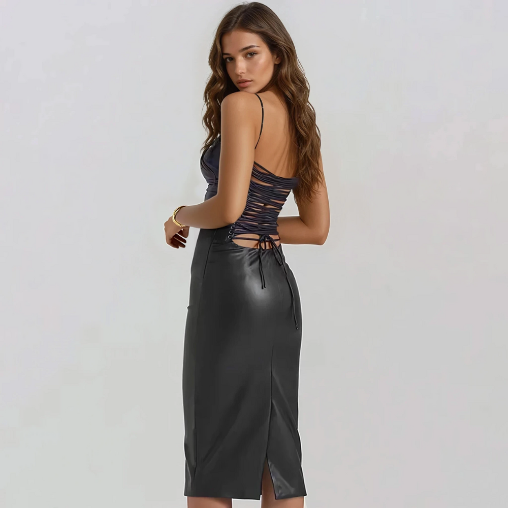 La robe Amara sublime votre silhouette grâce à sa matière en simili cuir stretch qui épouse les formes avec finesse. Sa coupe midi, sa ligne droite et ses fines bretelles créent une allure chic et minimaliste, tandis que son dos lacé apporte une touche sensuelle et sophistiquée.