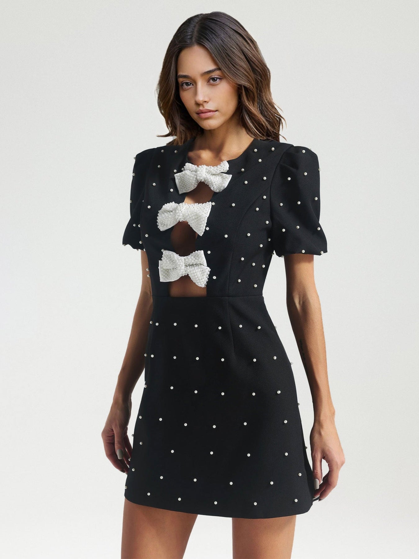 Ses pois blancs délicats et ses nœuds ornés de perles à l’avant lui donnent un style irrésistiblement féminin, tandis que ses manches bouffantes courtes apportent une allure moderne et flatteuse.