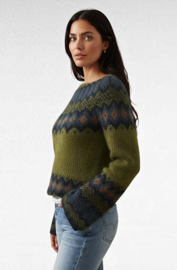 Le pull Anaëlle capture l’essence du style scandinave avec son motif traditionnel revisité et sa douceur enveloppante. Chaud, confortable et délicatement ample, il offre une allure cosy tout en restant résolument chic. Sa coupe flatteuse met en valeur la silhouette sans l’alourdir, pour un look hivernal moderne et raffiné.