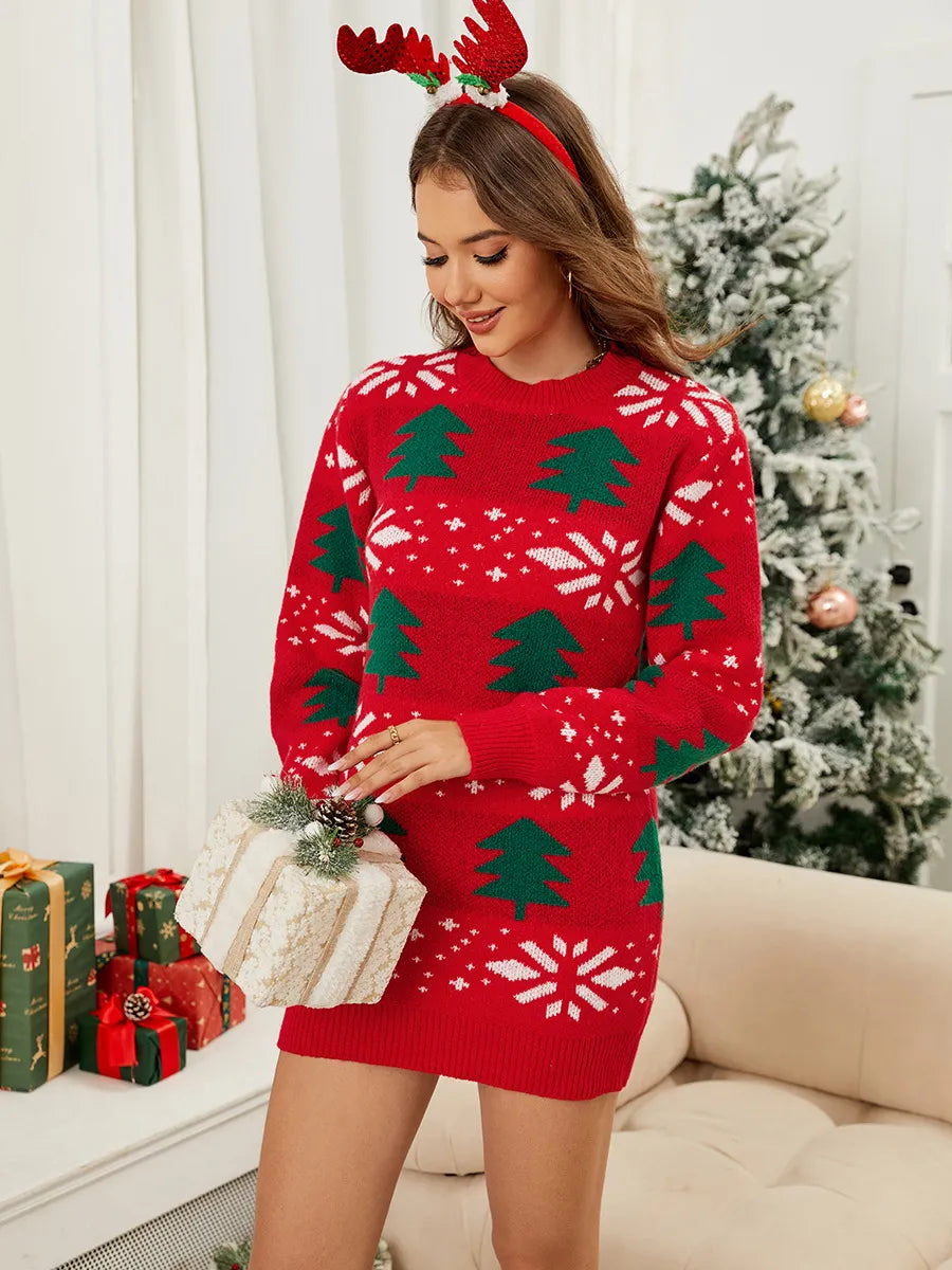 Avec ses sapins verts, ses flocons d’hiver et sa maille rouge chaleureuse, la robe pull Élise apporte instantanément une ambiance festive et cosy à vos tenues de saison.